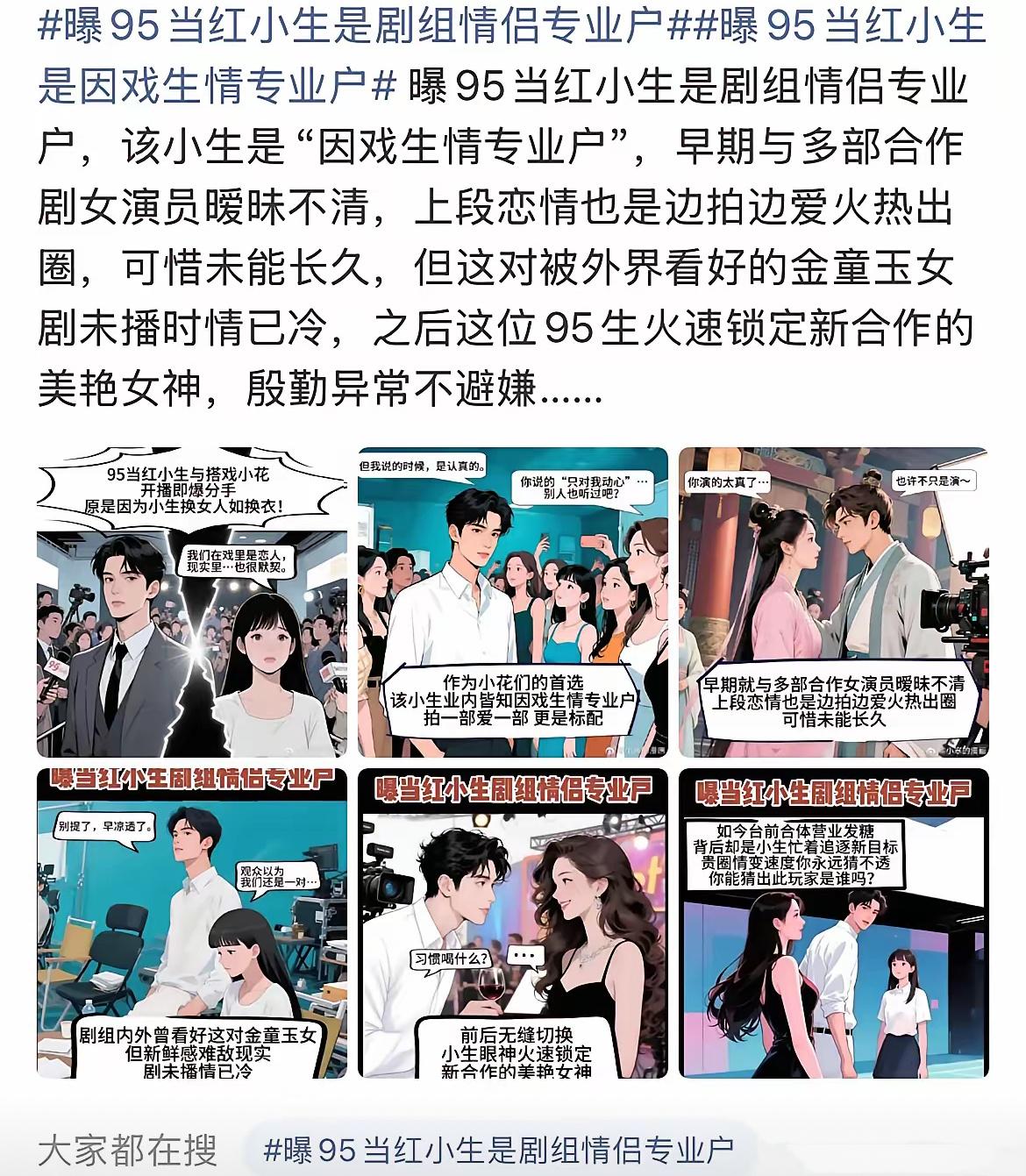 此前张小寒也透露圈内有一个“因戏生情专业户”,也是95当红小生,这个小生每每进入一个剧组,就和剧里面的女主角产生暧昧感情,和多部女主角都如此,每一次被外界看好最后感情都会凉凉,如今锁定了美艳女神献殷勤。值得深思的是被网友猜疑的对象却是圈内有名的富家公子哥,娱记称男方锁定暧昧对象只是为了借助对方资源炒作以及积累人气,一旦到手就立马分开,令人气愤。