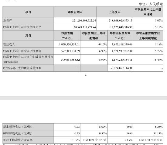 2025年前三季度,实现营业收入36.76亿元,同比增长1.18%;实现归属于上市公司股东的净利润15.72亿元,同比增长5.79%;第三季度营业收入为10.71亿元,同比下降0.10%;归属于上市公司股东的净利润为5.77亿元,同比增长6.99%。